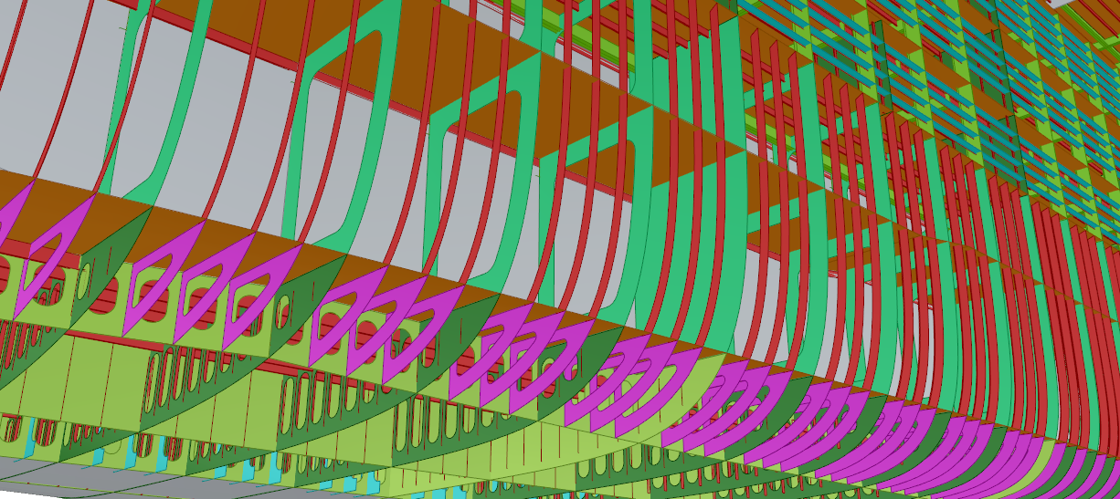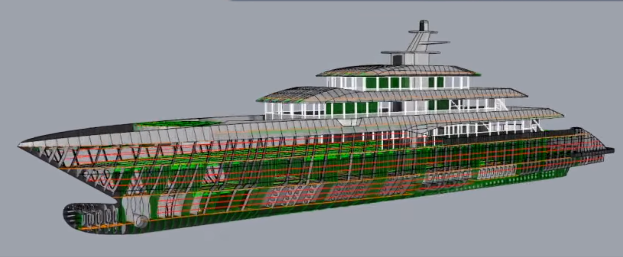 在 Rhino 中创建参数化结构模型。该模型可以用于获得精确的权重并快速启动 ShipConstructor 项目。更多信息请参加