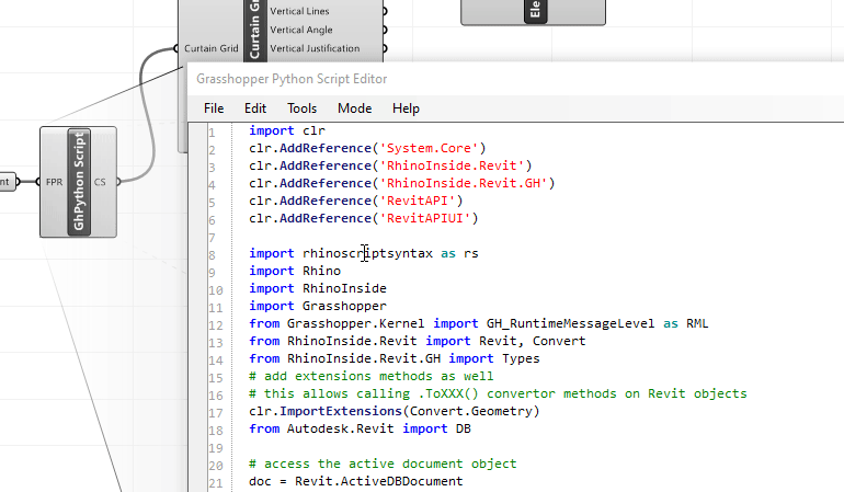 Rhino.Inside.Revit provides translation API to allow creating custom conversion workflows between your Revit data and Rhino geometry and metadata. This includes an advanced geometry conversion API to safely translate advanced Rhino shapes into Revit. The API is easily accessible from Grasshopper's Python or C# scripting components