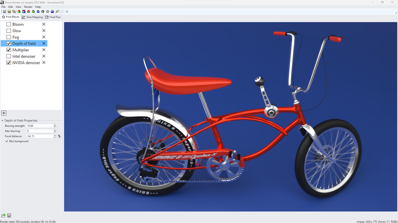 Rhino Render works as a real-time raytraced display mode, so you get fast feedback on your material, texture, and lighting choices. For “final” renders, work in a dedicated rendering window with access to post effects like fog, glare, and depth-of-field.