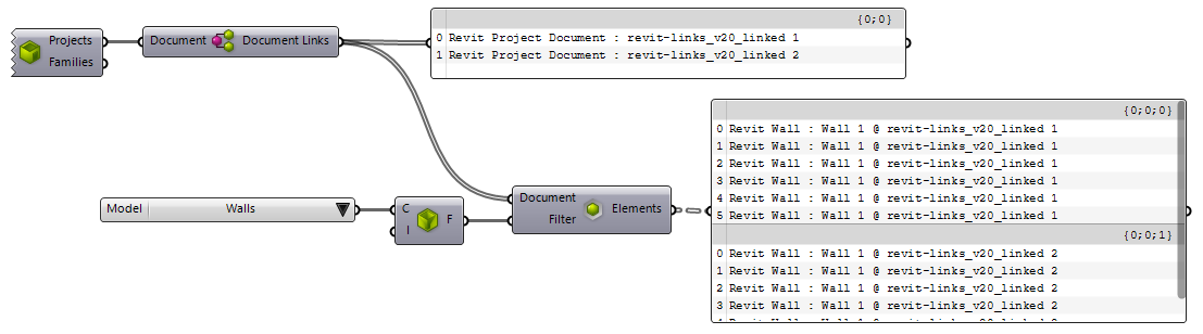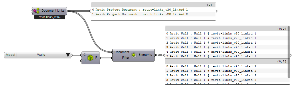 component always refers to the currently active document. Be aware that when you switch documents in Revit interface, the output of the component will be updated to reflect the newly activated document: