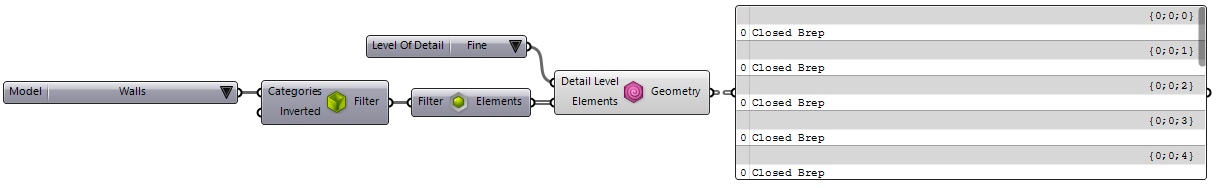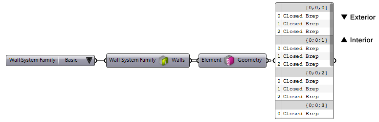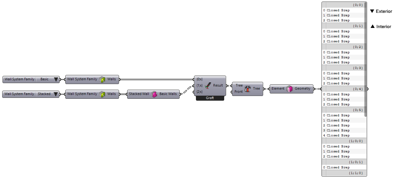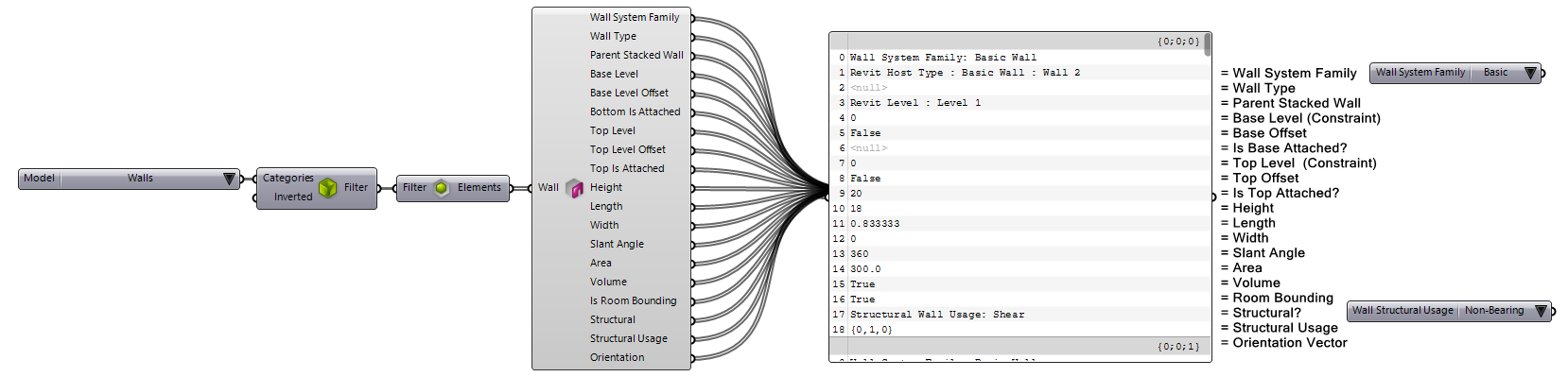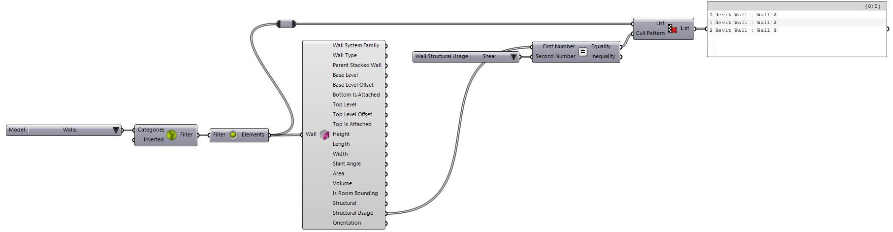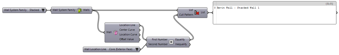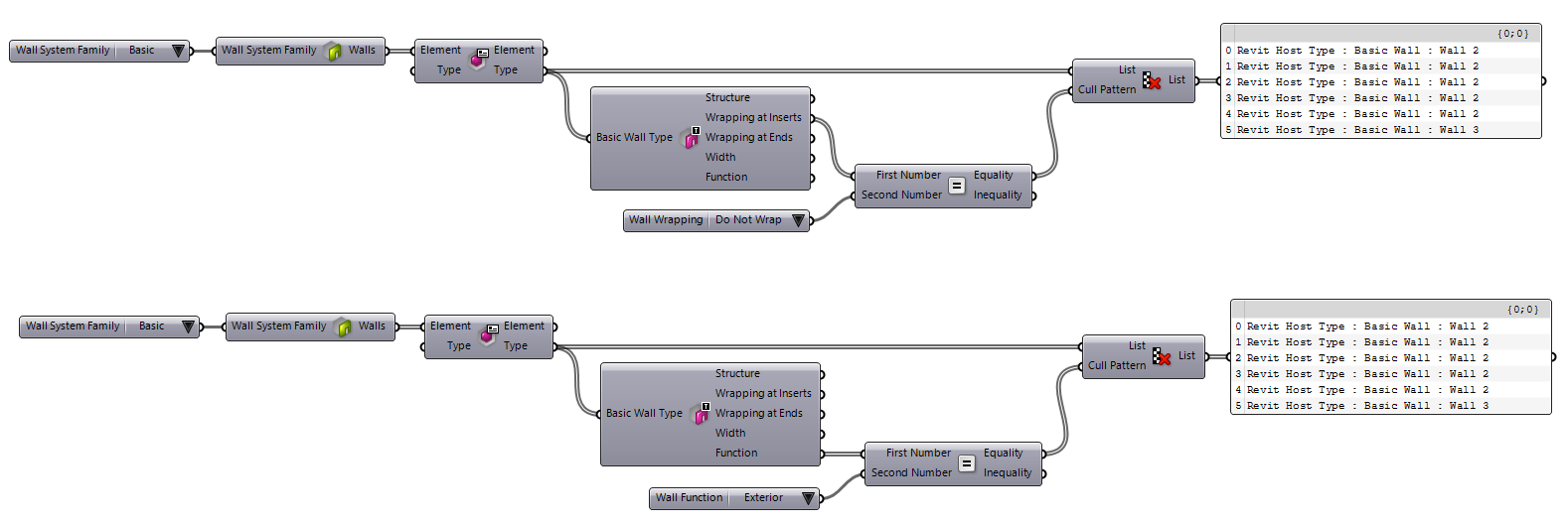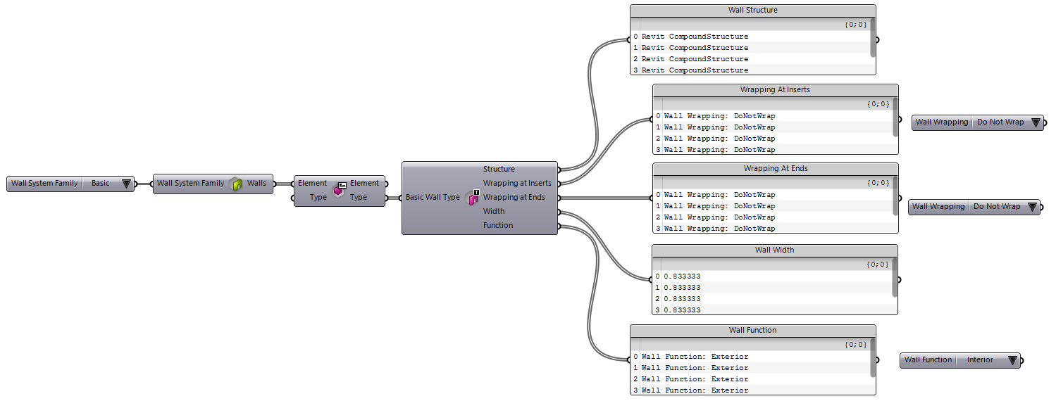 components (shown above in front of the parameter values panel) to determine which value is set on the parameter and filter the source wall types. The examples below show how this component are used to filter the wall types by Wrapping and Function: