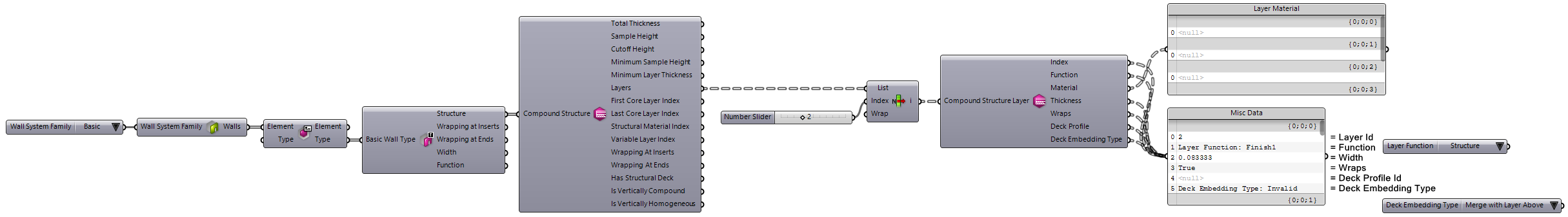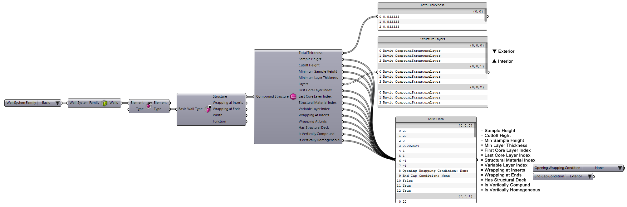 As shown above, layers are ordered from Exterior to Interior, matching the Revit GUI layer ordering. The example below shows a workflow to access individual layers by their index: