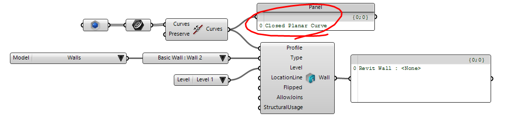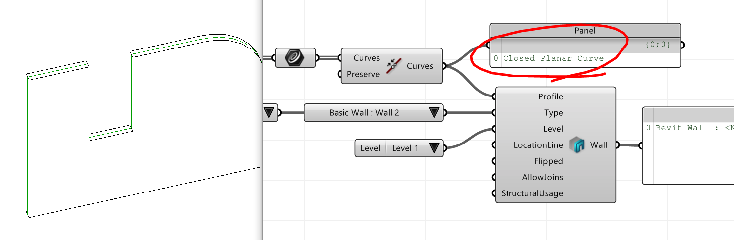 component to create a new wall based on the given profile curves. Note that the profile must be a closed loop, planar, and vertical. In this example we are using the Join Curves component from Grasshopper to join the curves. The