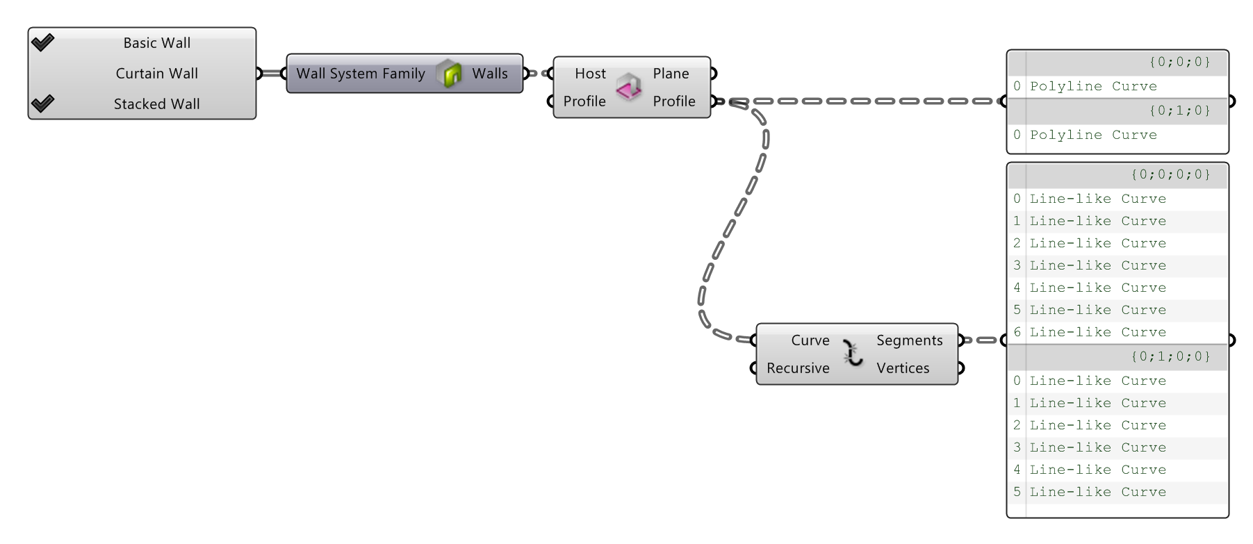component to select any combination of the builtin Basic, Stacked, or Curtain walls in Revit. You can then pass this selection as the input to the