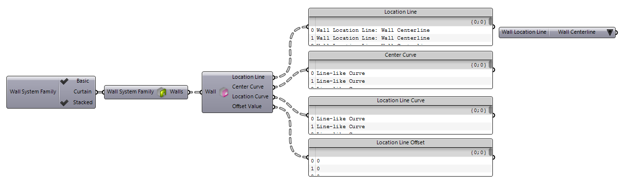 component shown here, can extract information about a wall location line. This component returns the center line curve, location line setting, curve, offset, and offset direction: