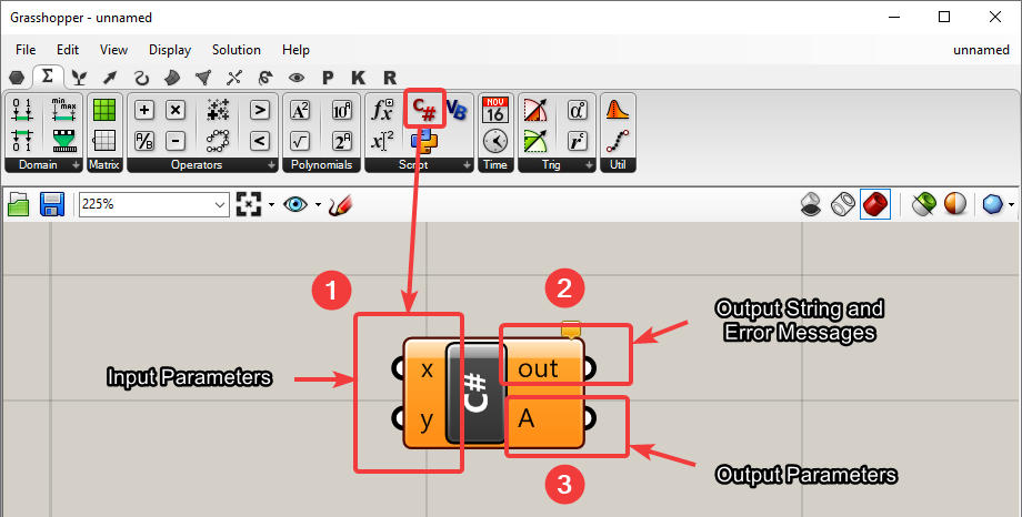 using Rhino.NodeInCode;Now you can access the component, like a function. These function names are prefixed with the name of their Grasshopper plugin to avoid naming conflicts. The example below shows how we can access the