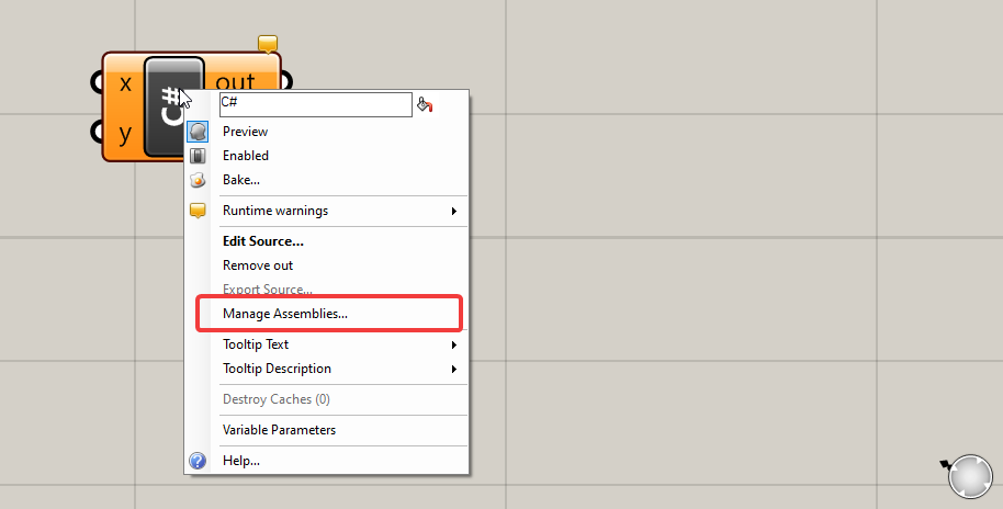 These two DLLs (Dynamically Linked Libraries) are located under the Revit installation directory (by default at %PROGRAMFILES%/Autodesk/Revit XXXX where XXXX is Revit version e.g. 2019). To bind these DLLs to your C# component, Right-Click on the component and select Manage Assemblies:
