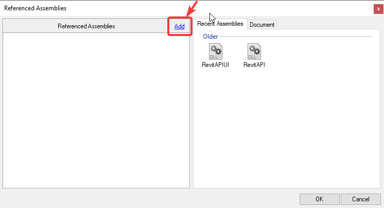 Click Add inside the Manage Assemblies window (or Drag and Drop from the Recent Assemblies list on the right, to the left panel):