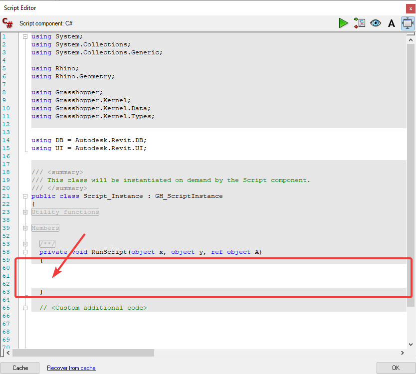 The code structure for C# Components is a bit more complex than the python scripted components due the complexity of the C# language itself. In C#, you can only create functions as methods of a class. Therefore, Grasshopper creates a required class named Script_Instance and will automatically create a RunScript method for this class. These pre-prepared code parts are marked with gray background and can not be deleted. The is the starting point for your code: