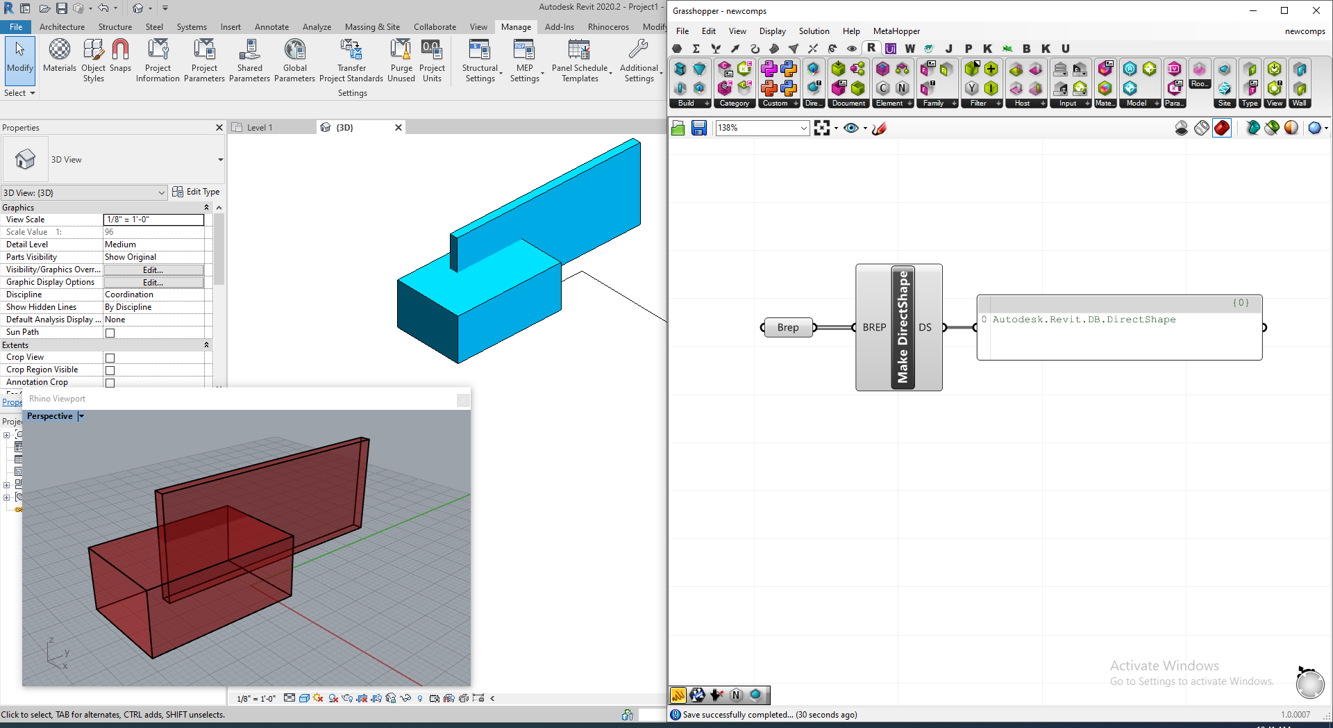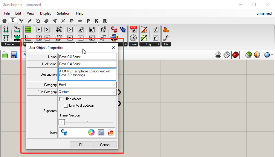 comp.Invoke()Now lets put this knowledge into use and create a custom scripted component that imports a Brep geometry into Revit and assigns a material to it. This scripted component effectively combines 3 different Grasshopper components into one. Note that there are obviously easier ways to do the same task, however this is a simple example of how components can be chained together in a script.